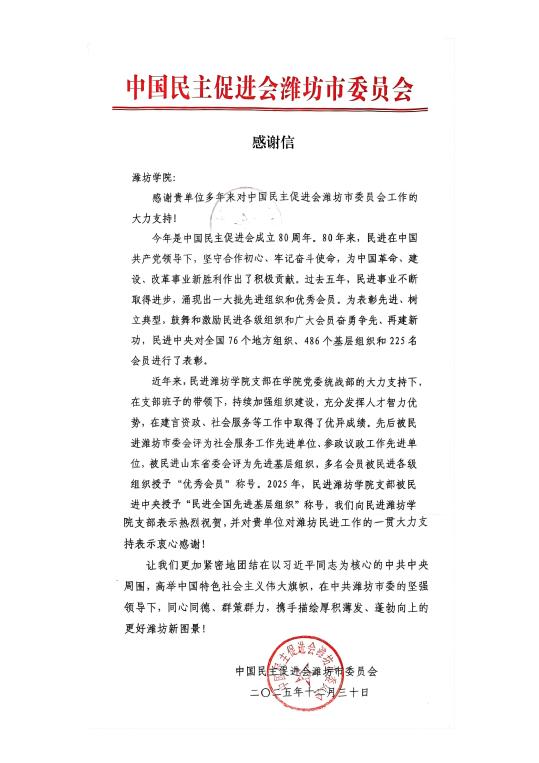 感谢信指出,今年是中国民主促进会成立80周年。民进始终在中国共产党领导下,与党同心同行、团结奋斗。近年来,民进潍坊学院支部在学校党委统战部的大力支持下,持续加强自身建设,充分发挥高校人才智力优势,在参政议政、社会服务等方面成效明显,先后获评民进潍坊市委会、民进山东省委会多项先进荣誉,多名会员获评“优秀会员”。2025年,该支部被民进中央授予“民进全国先进基层组织”称号。